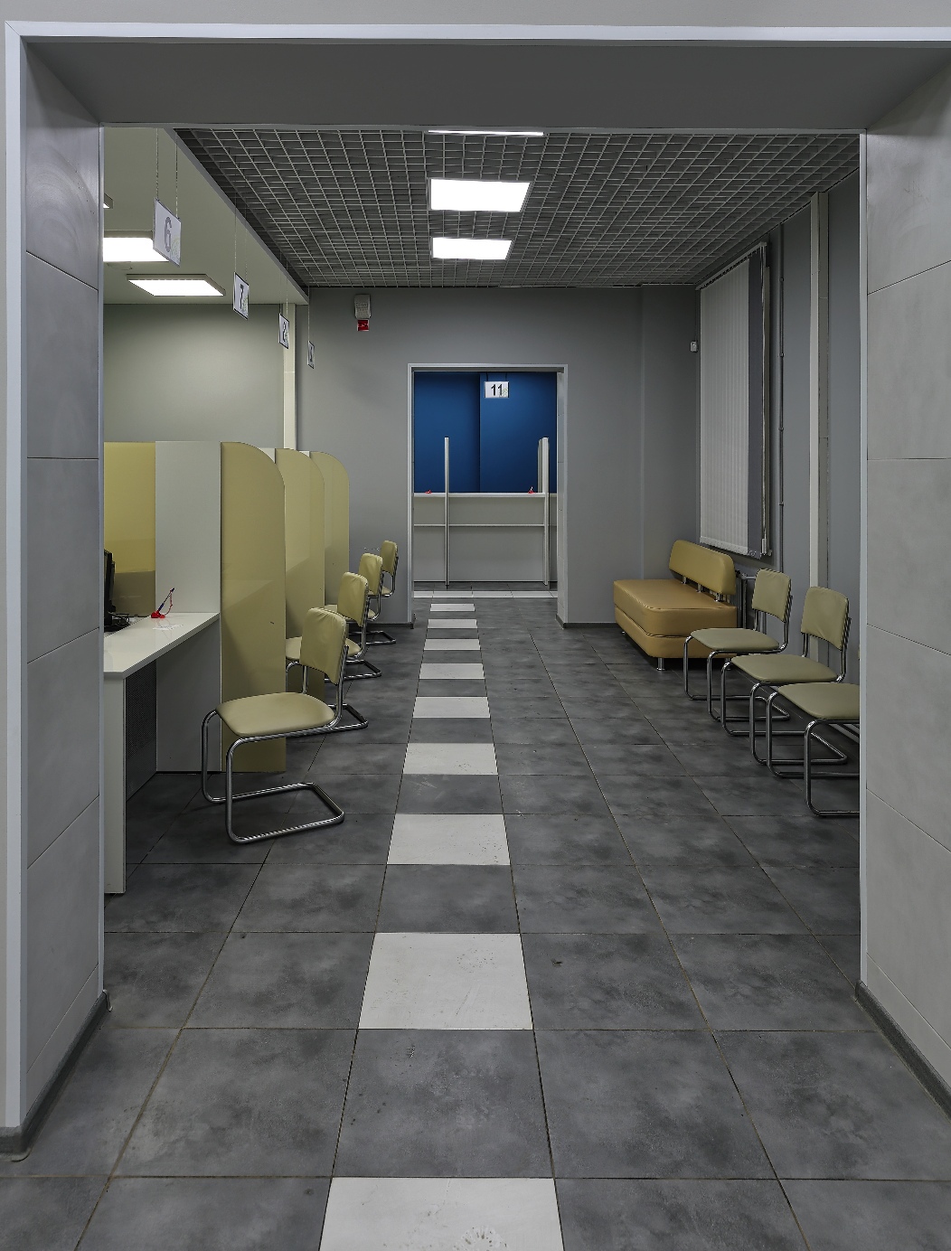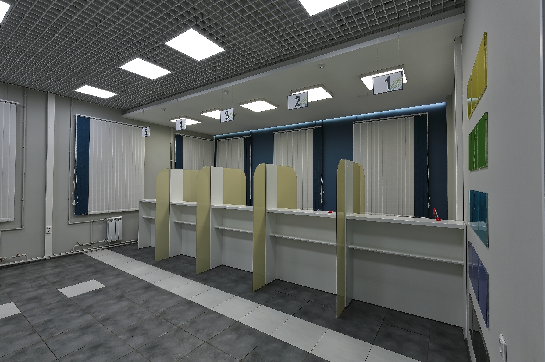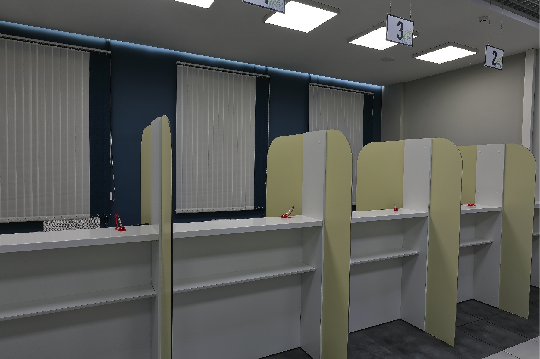 Для консультаций короткого характера изготовлены окна с высокой стойкой и подиумами для дамской сумочки или мужского портфеля.