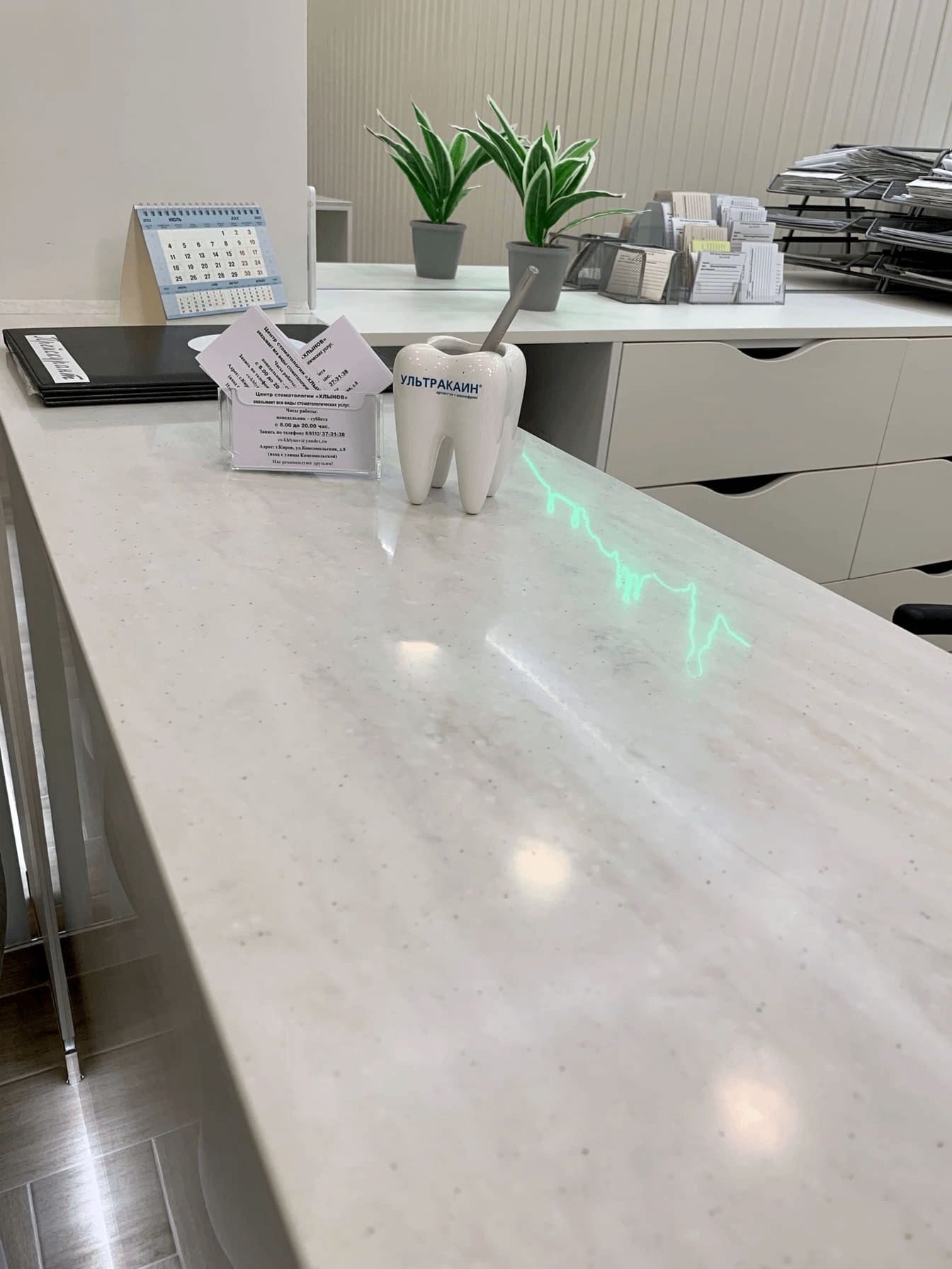 Ресепшен из искусственного камня выглядит эффектно и эстетично, не боится влажности и грязи, за ним удобно ухаживать. Гигиена в медицинском учреждении, с такой поверхностью - всегда будет на высоте!