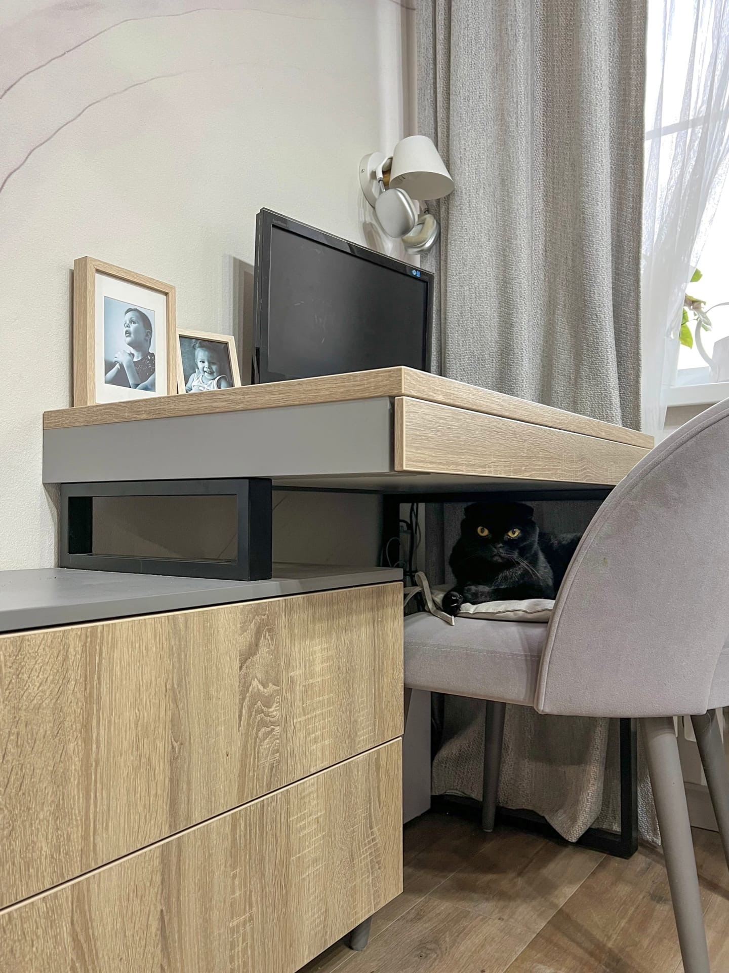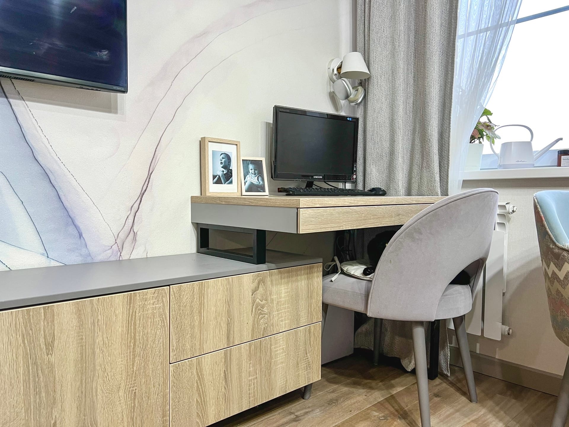 Тумбу можно использовать как систему хранения. В ней удобно скрыть провода.