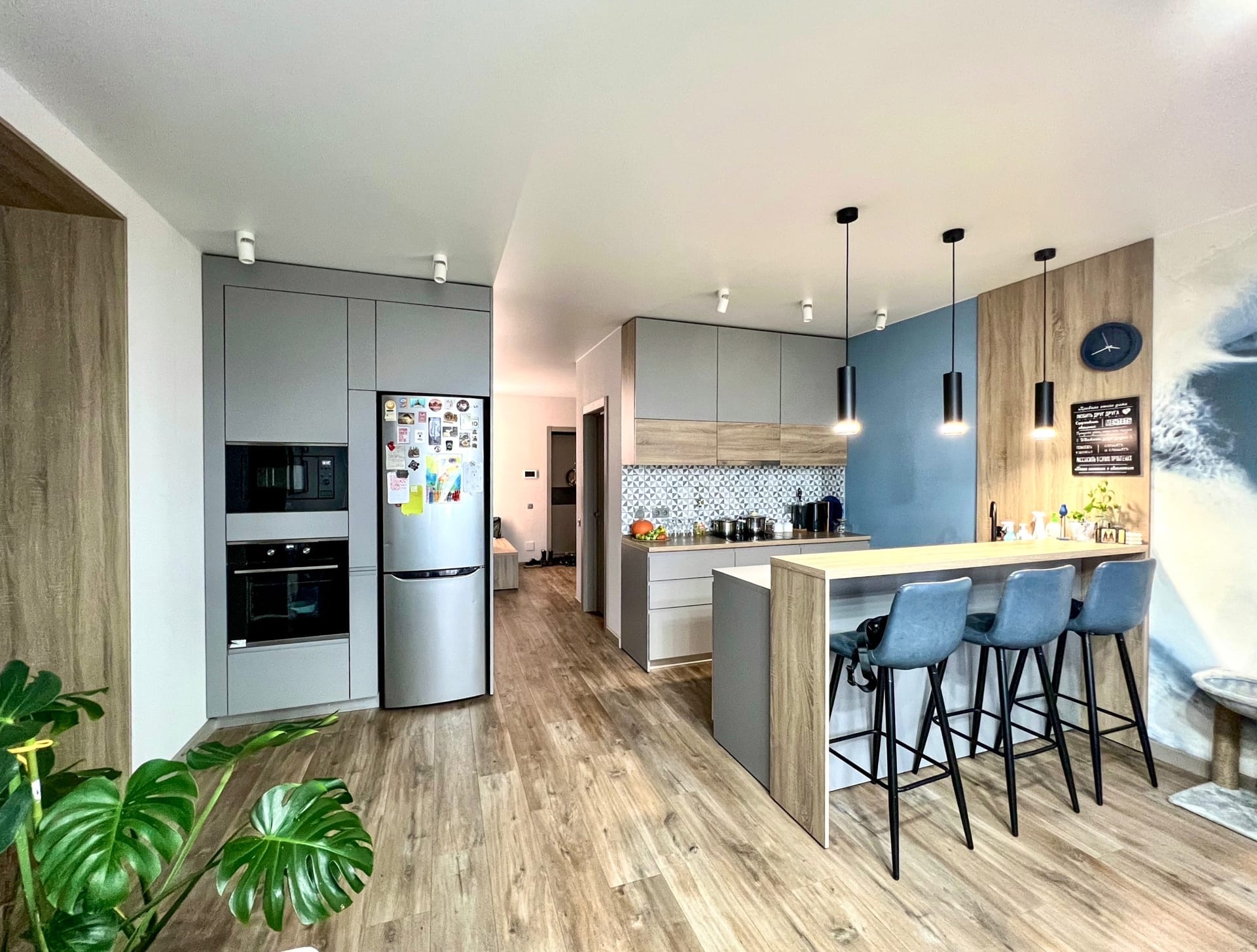 Эффектная кухня, благородного серого цвета в сочетании с древесным декором, смотрится невероятно уютно.