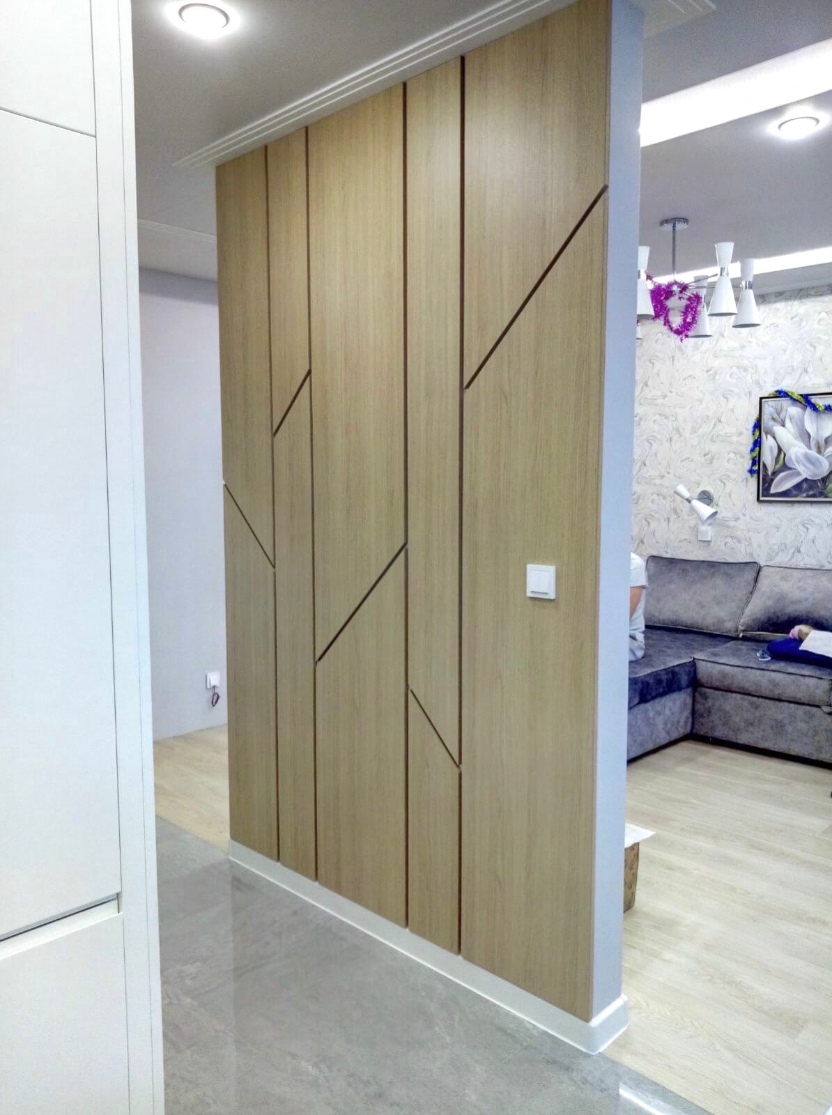 Декоративная панель эффектно разделяет зону гостиной и кухни.