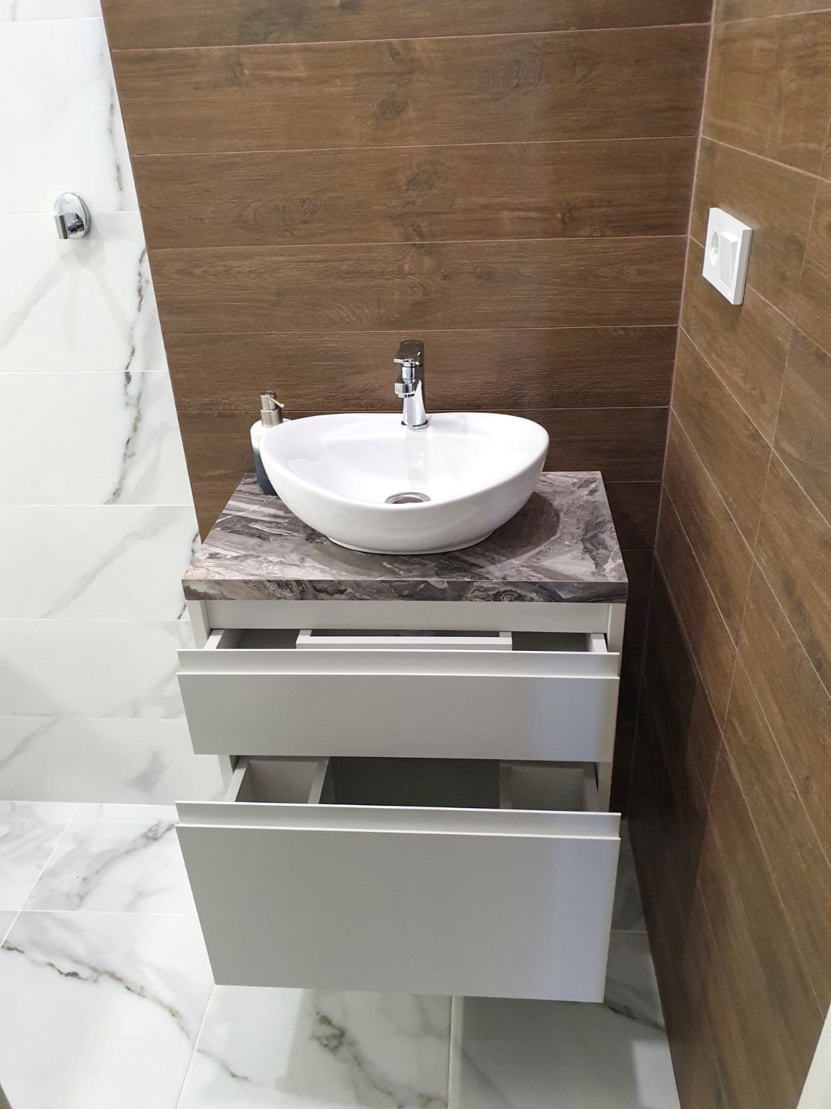 В ванную комнату была изготовлена тумба под раковину и шкаф для хранения.