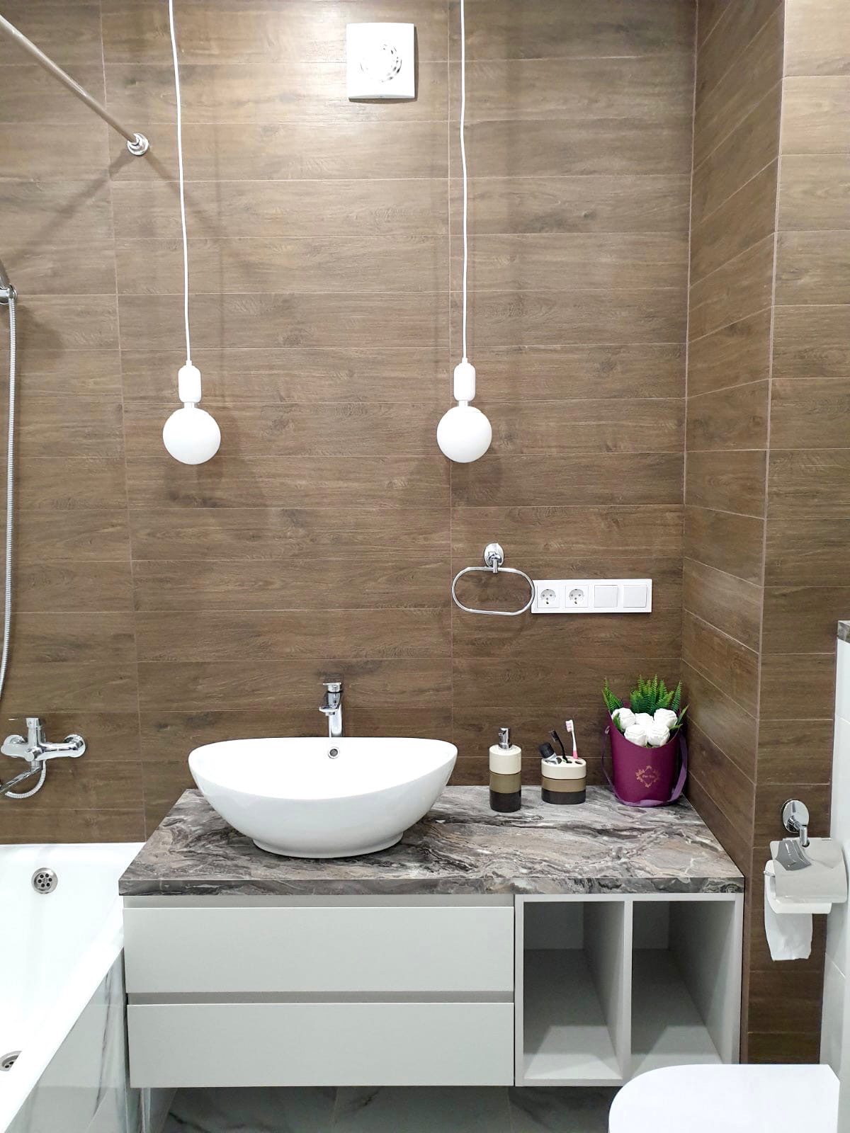 Шкаф в ванной комнате выполняет функцию хранения и в нем скрыт водонагреватель.