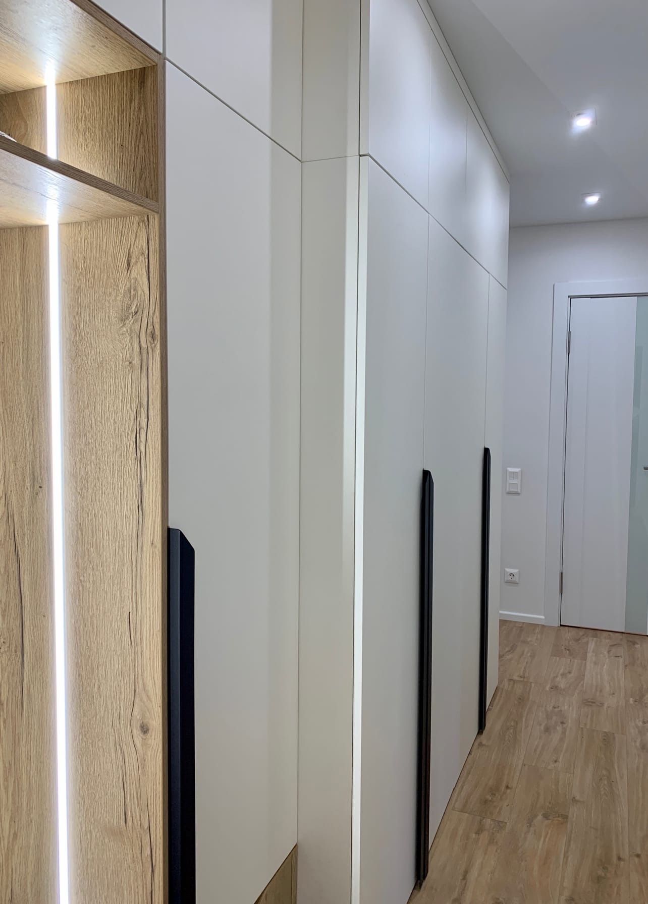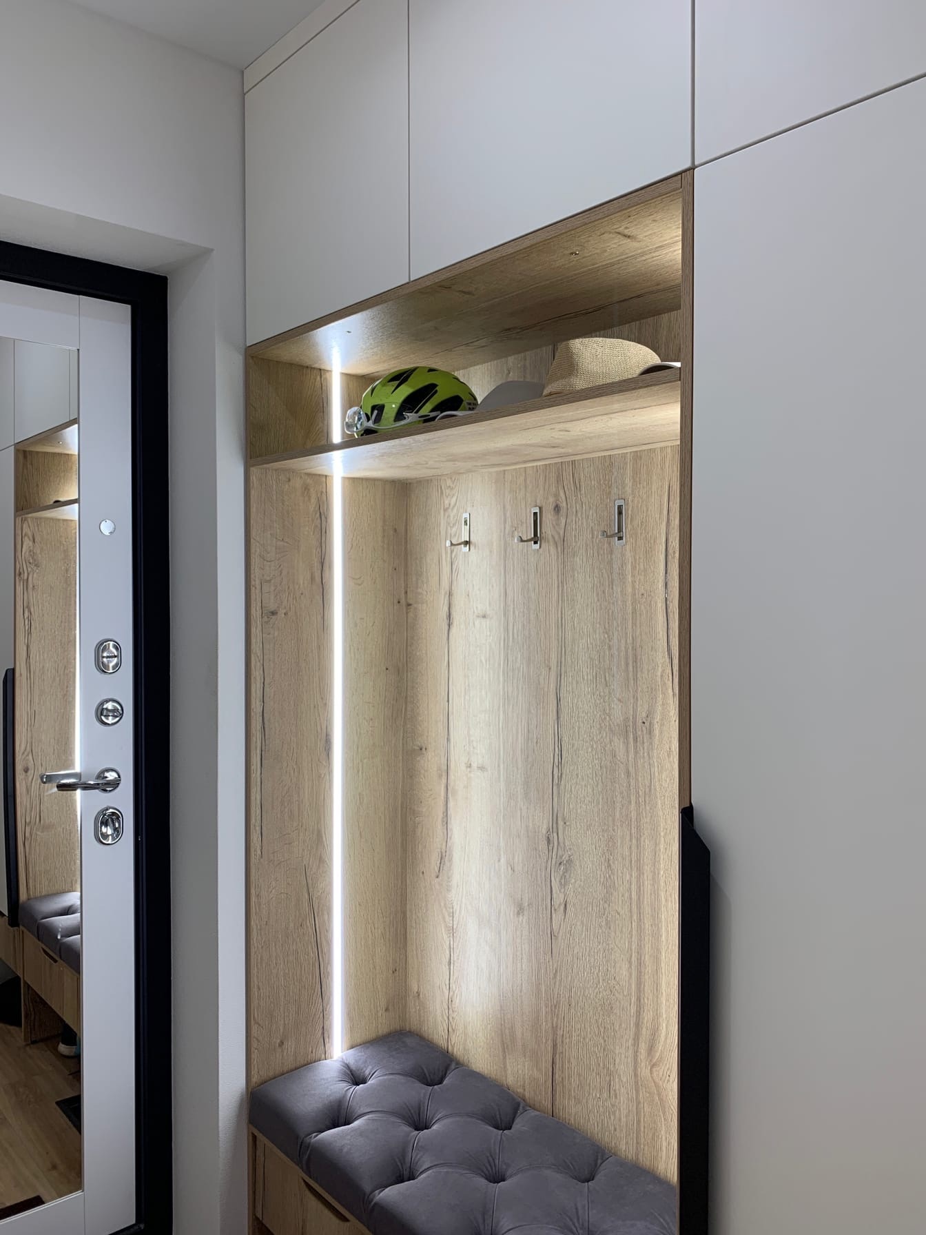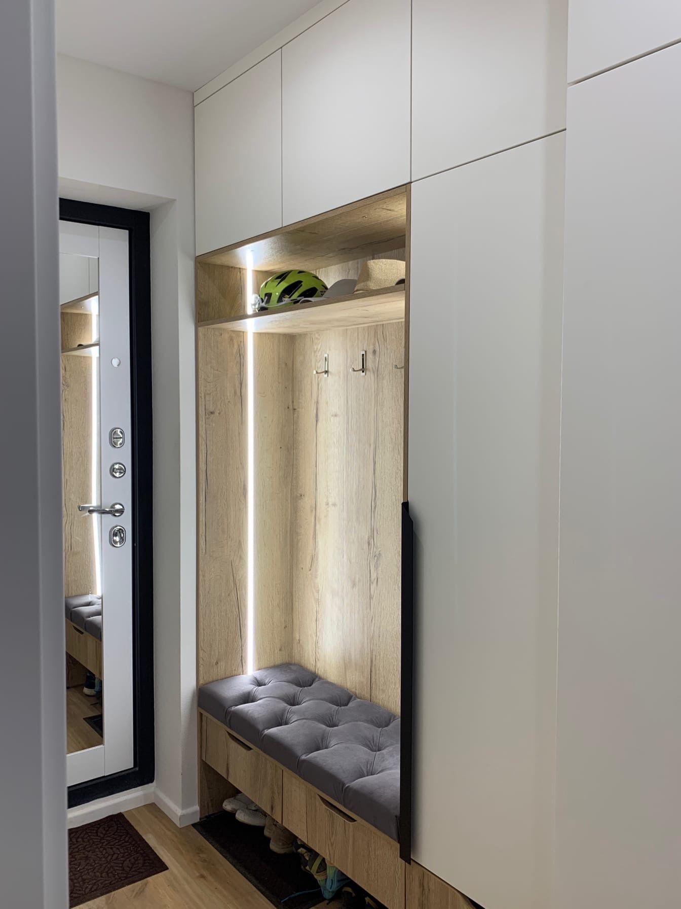 Врезная подсветка в открытой зоне, придает шарма и уютности прихожей.