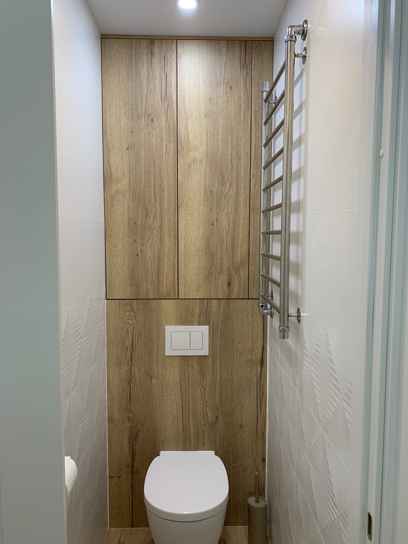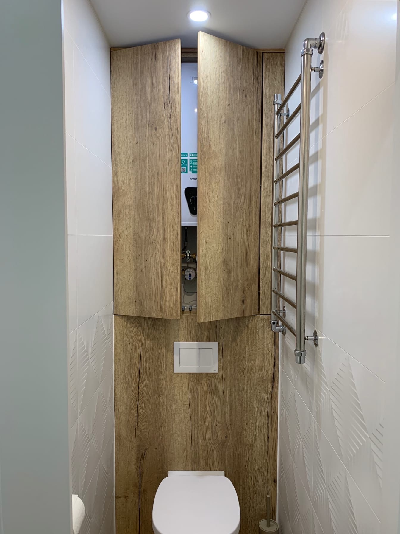 В маленьком пространстве туалета хранение и коммуникации эстетично скрыты во встроенный в стену шкаф.