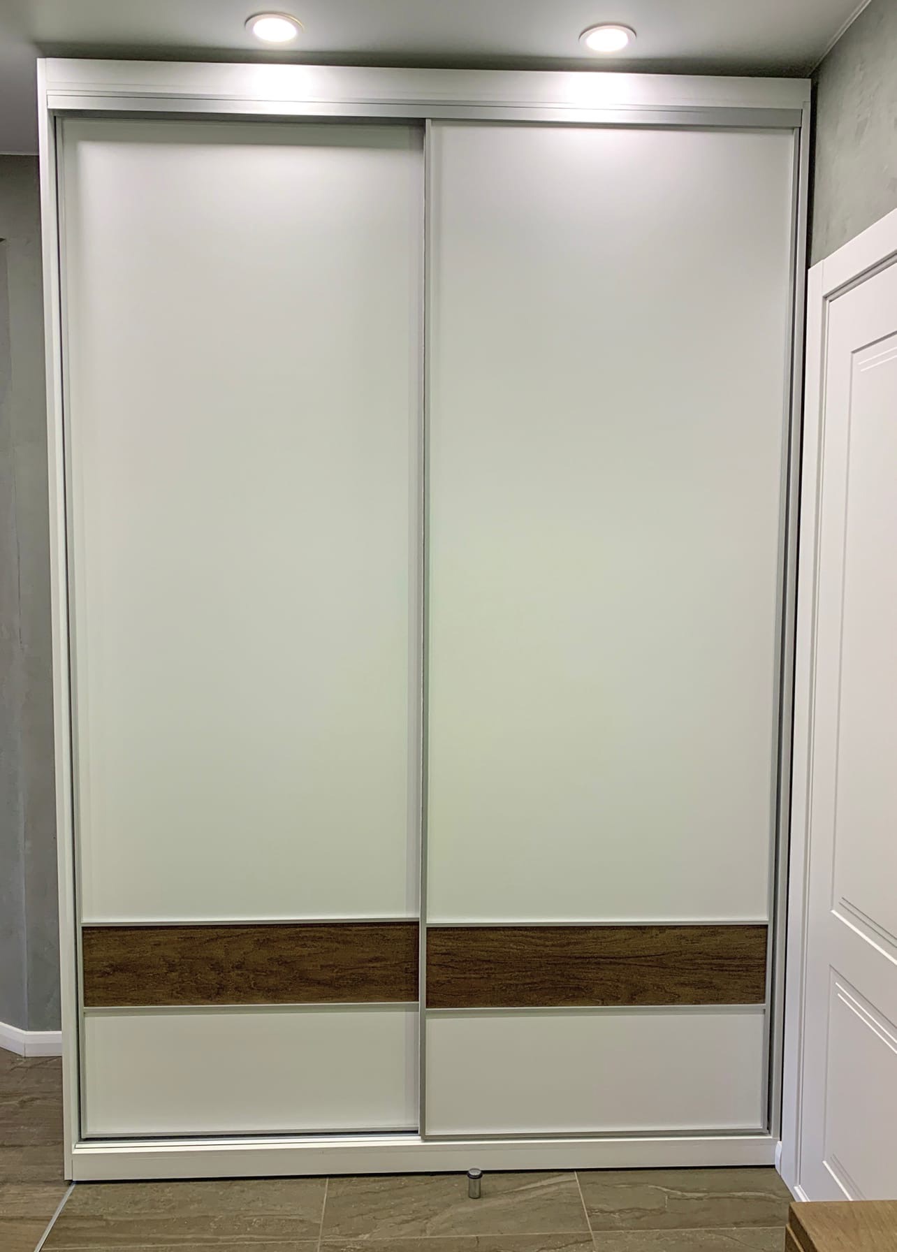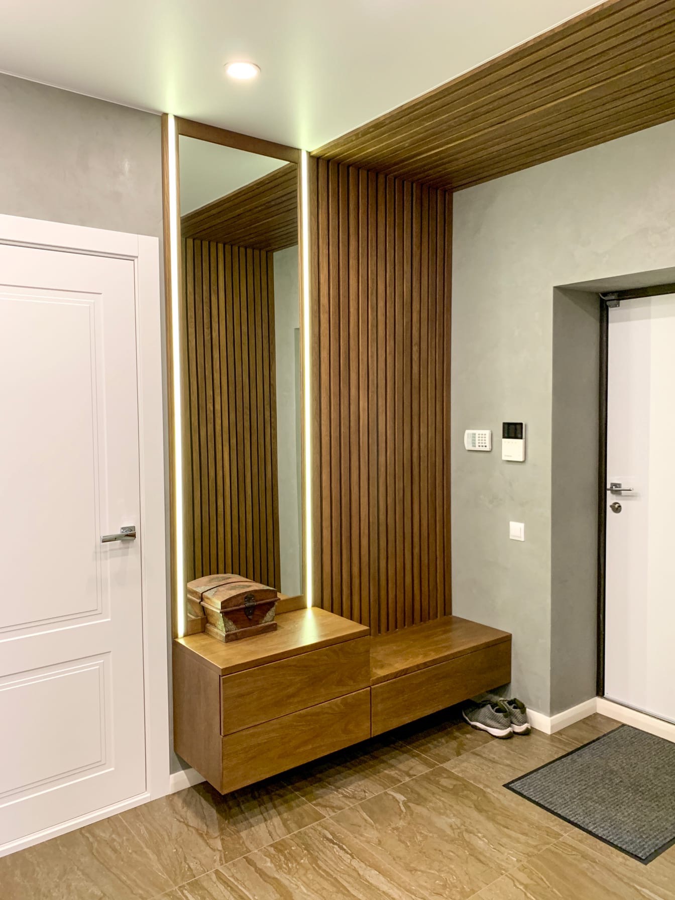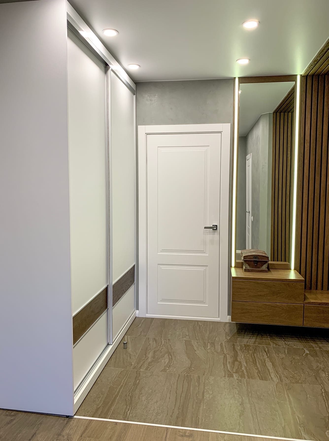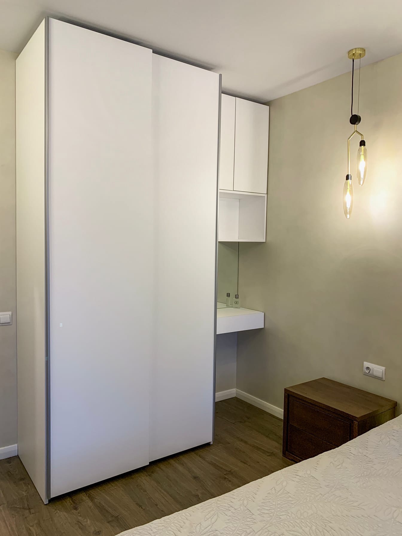 Современный шкаф-купе,совмещенный с дамским столиком, зеркалом и системой хранения сверху.