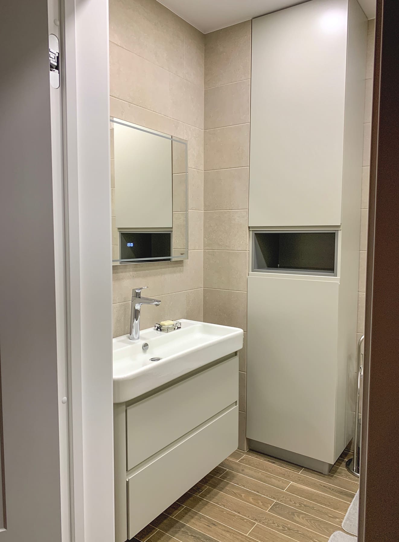 В ванную комнату была изготовлена тумба под раковину и шкаф для хранения.