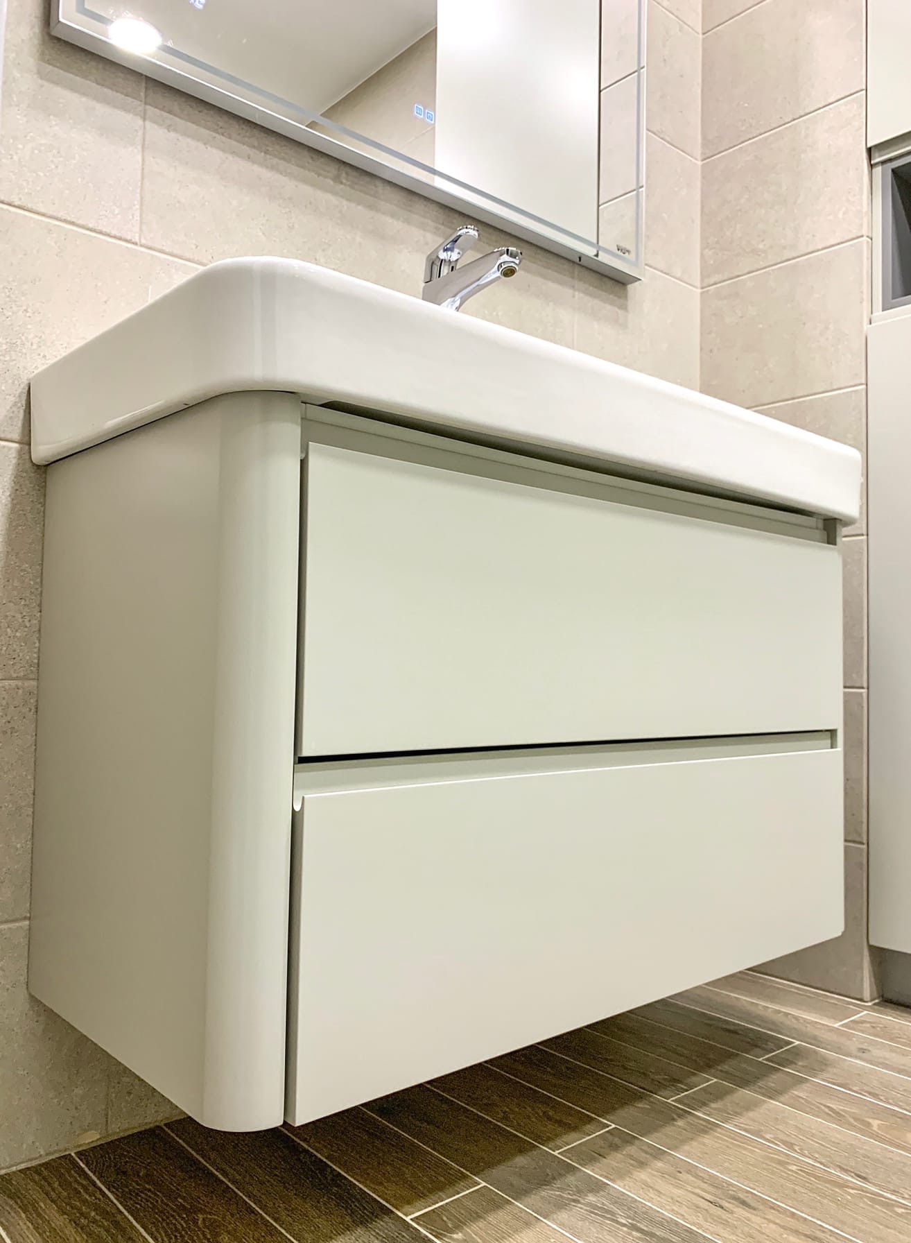 Фасады тумбы и шкафа выполнены из МДФ в Эмали, открывание за интегрированную ручку.