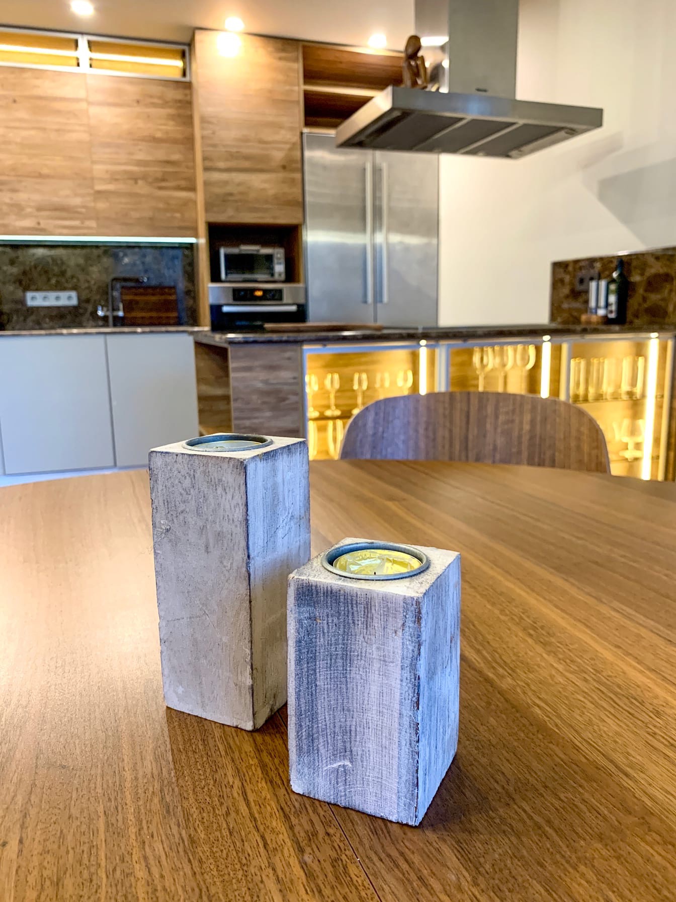В дизайне кухни использованы акцентные элементы: аквариум с живыми рыбками и остров со столешницей из натурального камня.