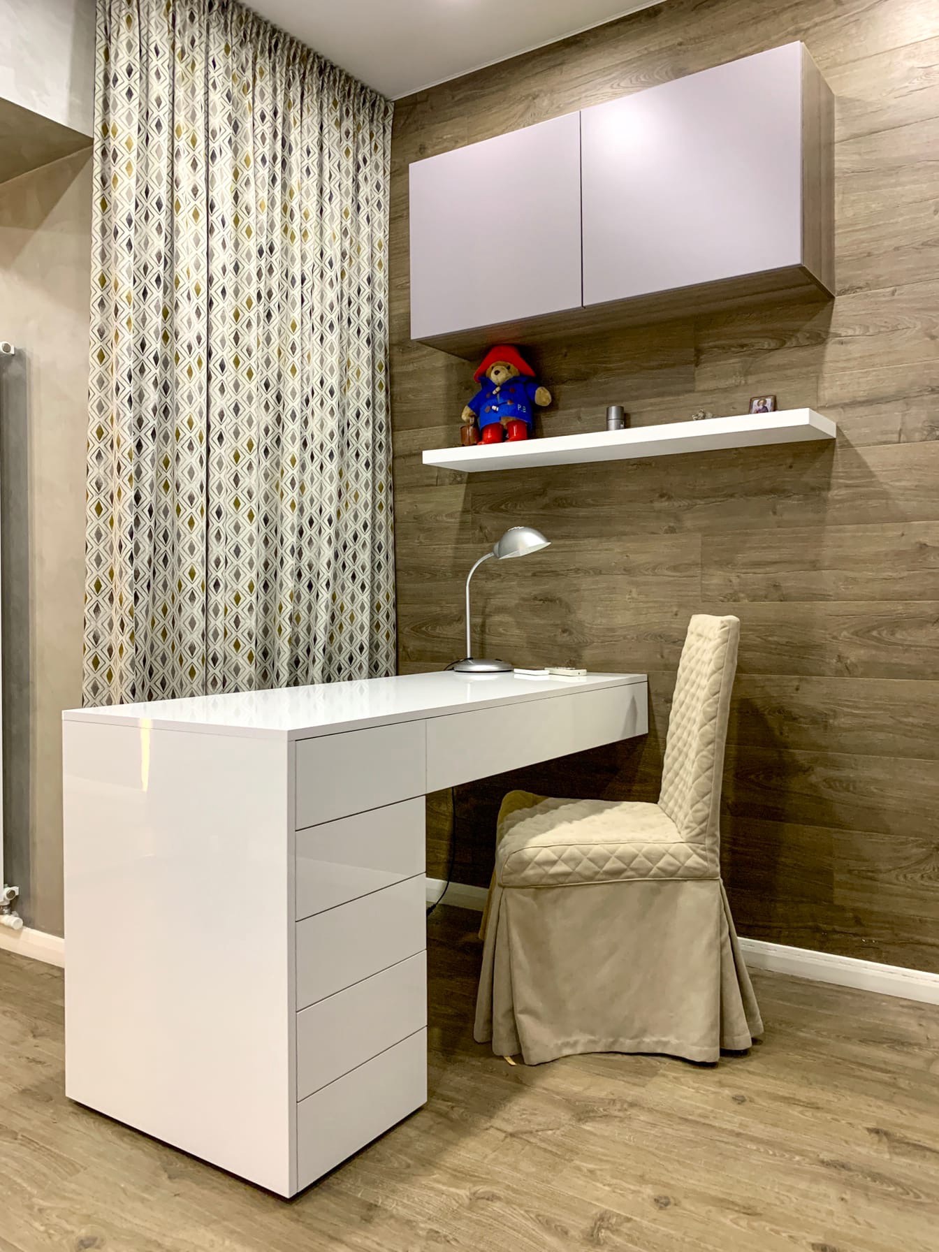 Обратите внимание, как гармонирует между собой тумба из натурального дуба (кровать у хозяев также из натурального дуба), с корпусной мебелью в белом исполнении.