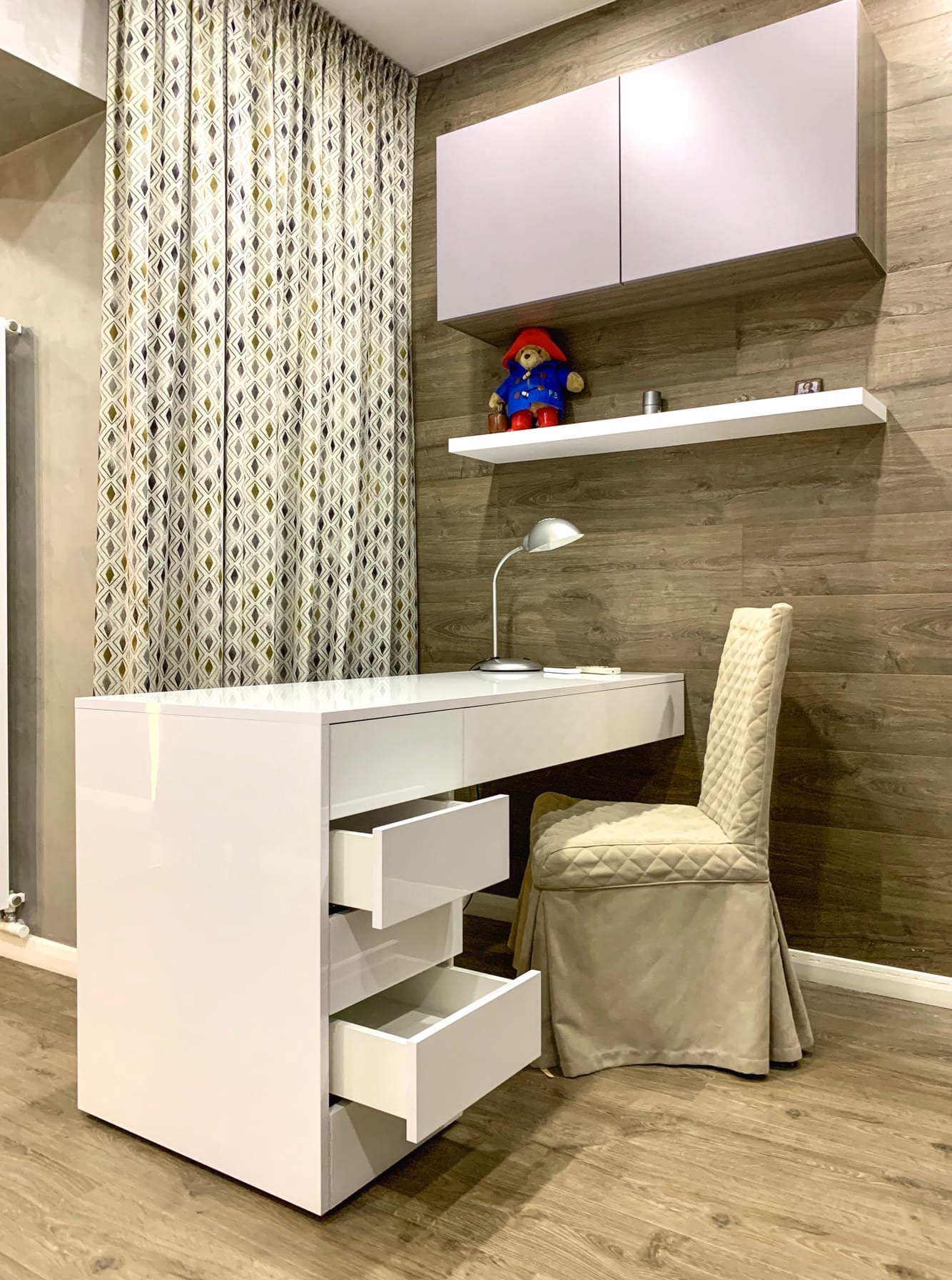 Лаконичный и минималистичный стол с выдвижными ящиками и большой рабочей поверхностью. Выполнен из ЛДСП белого цвета, открывается с помощью нажатия на фасад ящика.